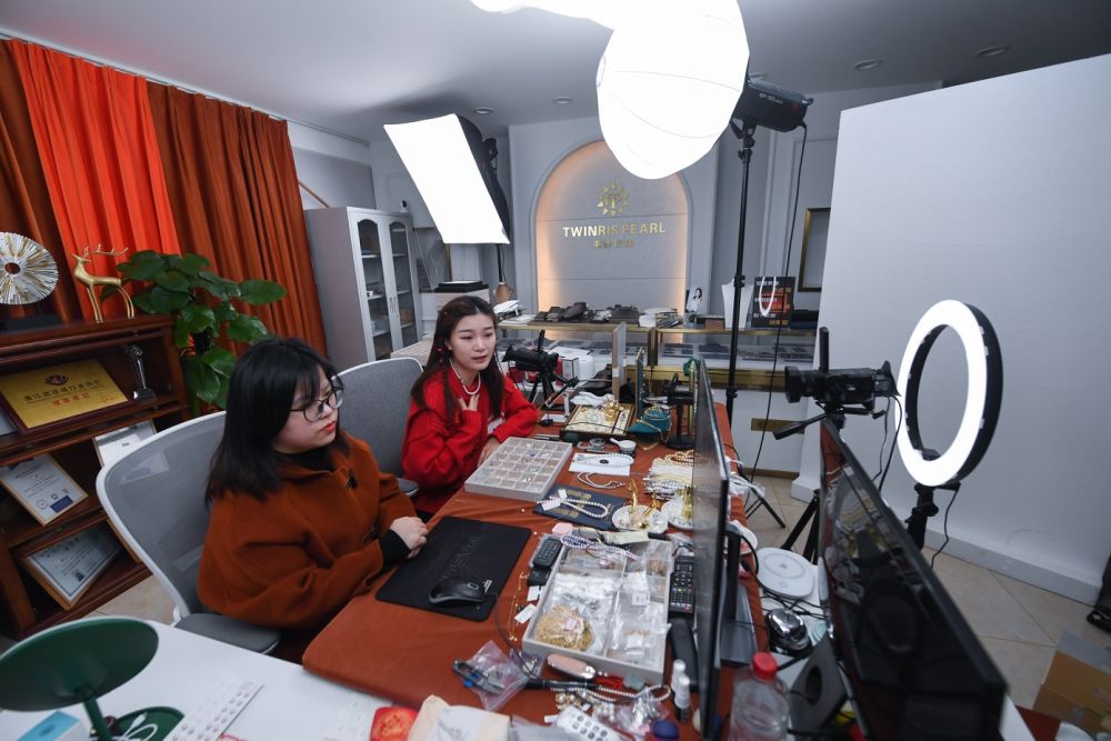 ↑2021年3月2日,林益坤(右)在位于诸暨市山下湖镇的工作室内进行自己品牌珍珠饰品的直播销售。“90后”女孩林益坤大学毕业后从事珍珠养殖批发行业,2020年初受到疫情影响,林益坤与丈夫开始尝试组建直播团队,进行风格化的网上直播销售。目前,林益坤的淘宝直播间平均每天有5万多人次观看,日均销售额超过40万元,2020年她的珍珠线上销售额突破1亿元。