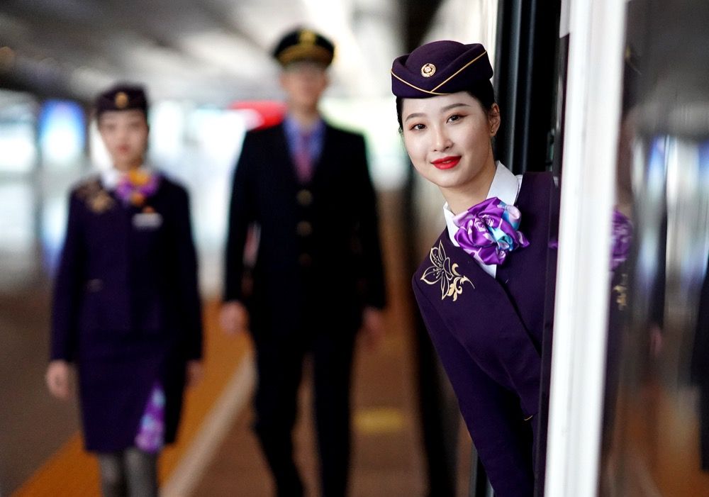 ↑ 2020年1月2日,G7194次列车“00后”乘务员高文婕在上海虹桥火车站观察旅客进站乘车情况。