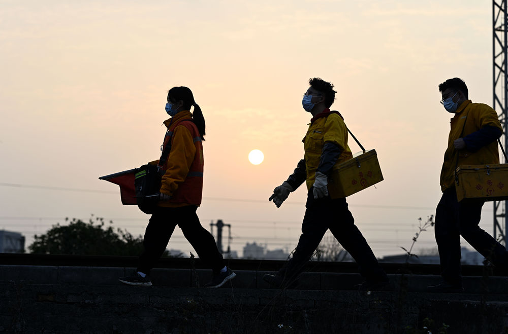 ↑ 2021年2月2日,在广西柳州南编组站驼峰场,柳州电务段柳州南三场驼峰工区的工人走进站场准备开始作业。驼峰场的28名工人中有19人是“90后”。春运期间,柳州电务段成立青年突击队,每天利用早上40多分钟没有列车行驶的“天窗点”,对驼峰场上的道岔、风管、压缩机等设备进行检修,确保满载各类物资的列车顺利经驼峰场解体、编组,安全驶向全国各地。