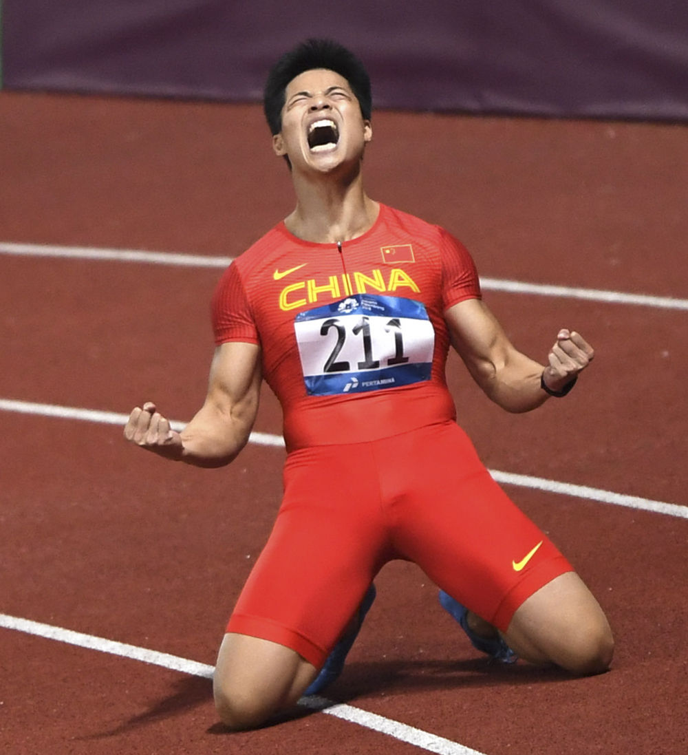 ↑ 2018年8月26日,1989年出生的中国选手苏炳添在第18届亚运会男子100米决赛后庆祝。苏炳添以9秒92的成绩获得冠军。此前,他在世界田径挑战赛马德里站和钻石联赛巴黎站两度跑出9秒91,追平亚洲纪录。