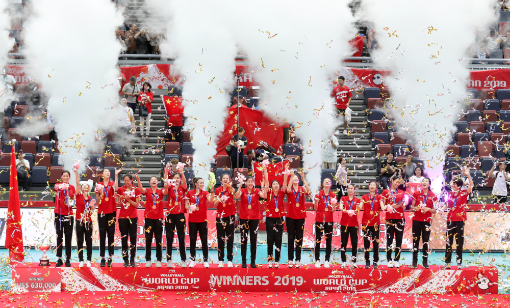 ↑ 2019年9月29日,中国队在颁奖仪式上庆祝夺冠。当日,2019年女排世界杯赛颁奖仪式在日本大阪举行,中国队在本届比赛中以十一连胜的战绩夺得冠军。
