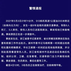 据浙江省湖州市公安局、高速公路交警支队4日通报,3日21时11分许,S13练杭高速公路1公里加200米附近(由南向北方向),发生一起6车追尾的交通事故,导致6人死亡、3人受伤。通报称,目前3名伤员正在接受治疗,病情平稳。事故原因正在进一步调查中。