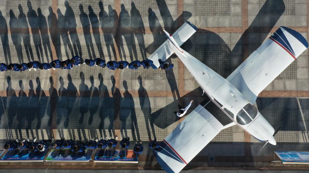 2020年12月17日,河北省唐山市丰润区综合职业技术教育中心飞机维修专业教师在给学生上课(无人机照片)。新华社记者 牟宇 摄