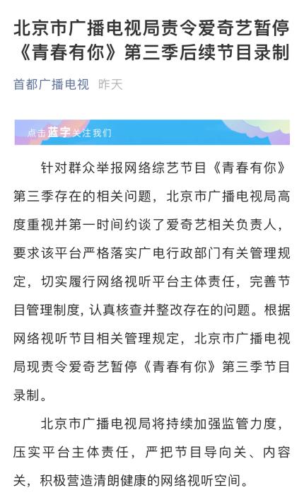 5月4日,据北京市广播电视局消息,根据网络视听节目相关管理规定,北京市广播电视局责令爱奇艺暂停《青春有你》第三季后续节目录制。