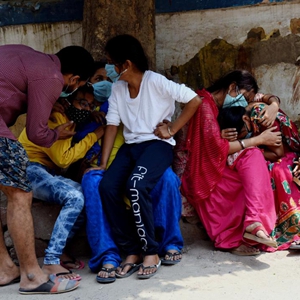 5月5日,在印度巴特那的一所医院外,因新冠失去亲人的人们神色悲伤。