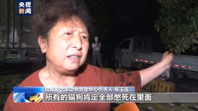 成都爱之家动物救助中心负责人 陈玉莲:这个车子拖了一车(猫狗)过来,总数是156只,然后我们就追随过来,然后他们就把车上的猫狗转上到这个车。大家看一下这个厢式货车,全封闭的,把两道后门一关,所有的猫狗肯定全部憋死在里面。