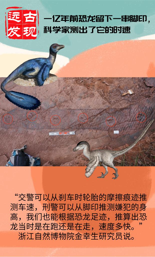 “交警可以从刹车时轮胎的摩擦痕迹推测车速,刑警可以从脚印推测嫌犯的身高,我们也能根据恐龙足迹,推算出恐龙当时是在跑还是在走,速度多快。”金幸生研究员说。