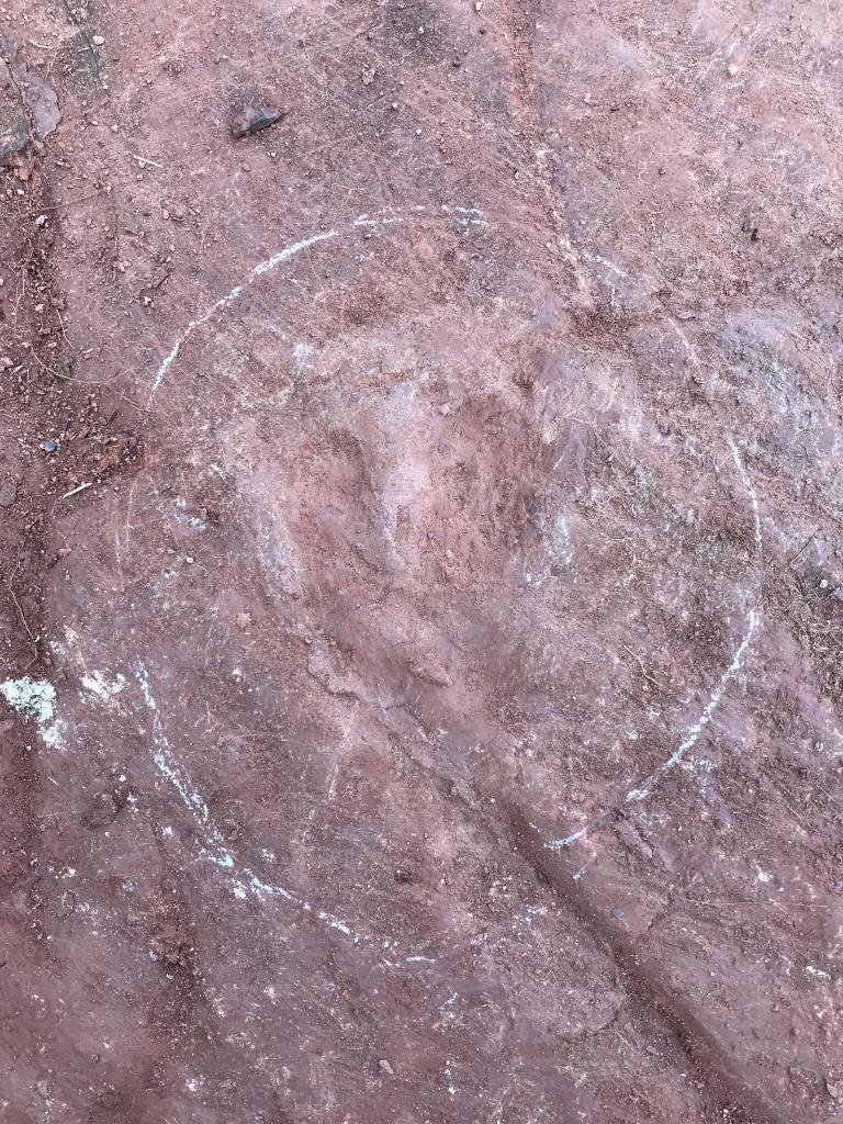 金幸生团队2019年在浙江义乌发现了这片化石,其足迹与四川伶盗龙足迹相吻合。伶盗龙属于恐爪龙类,它们后脚第二脚趾的爪子特别大,高高抬起,一般不着地。因此,恐爪龙行走时,后脚只有第三、四趾着地,脚印是非常典型的二趾结构。