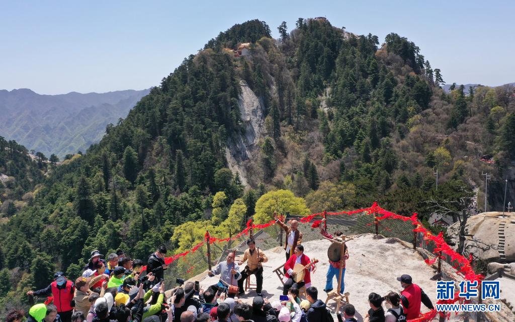 华山景区西峰索道“华阴老腔团”在华山西峰之巅为游客表演(5月5日摄,无人机照片)。新华社记者 陶明 摄