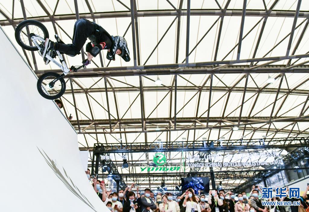 在上海举行的第30届中国国际自行车展览会上,一名小骑手为观众表演车技(5月5日摄)。新华社记者 李贺 摄