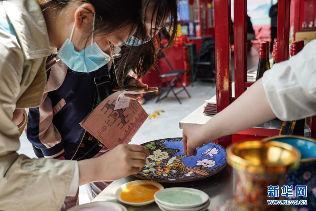 在北京前门大街举行的“前门国潮京品节”上,游客在体验景泰蓝的点蓝技艺(5月2日摄)。新华社记者 彭子洋 摄