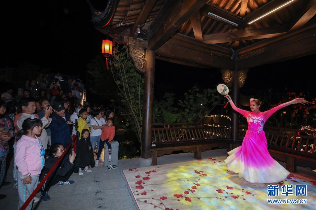 在浙江省建德市梅城镇的严州古城,游客观看夜间表演(5月2日摄)。新华社记者 徐昱 摄