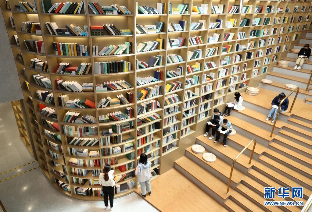 读者在安徽省蒙城县图书馆天梯书架旁阅读书籍(5月2日摄)。新华社发(胡卫国 摄)
