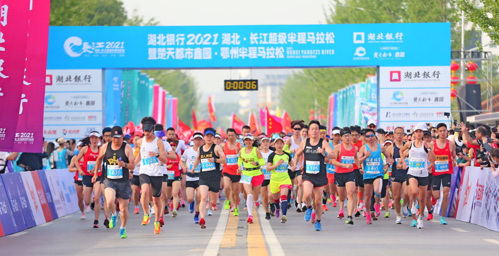 5月5日,在湖北银行2021湖北·长江超级半程马拉松鄂州站,参赛选手从起点出发。(赛事主办方供图)
