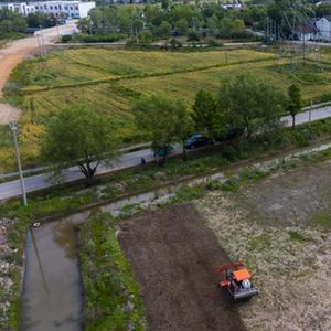 在东林镇保永村,种植户操作旋耕机耕地,准备播种水稻(5月7日摄,无人机照片)。
