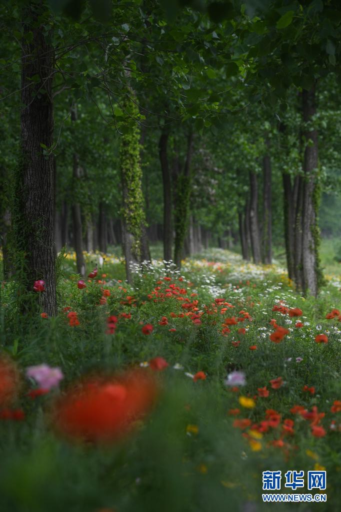 在东林镇东升村,田野边的树林中鲜花盛开(5月7日摄)。