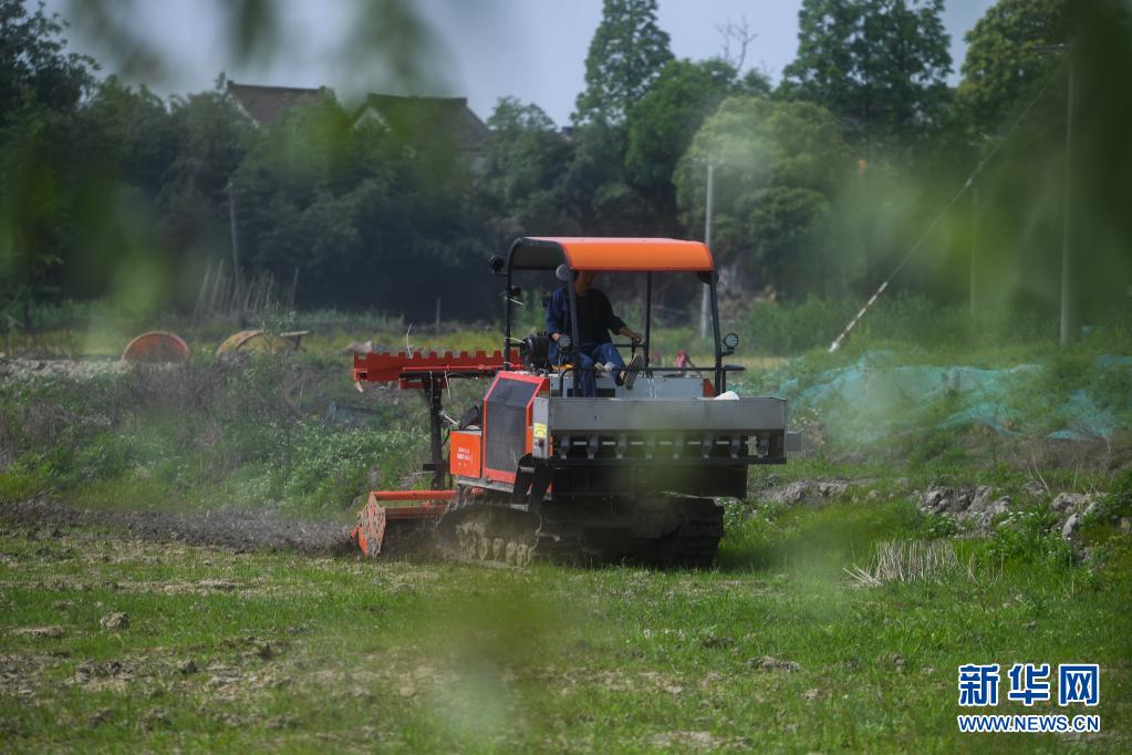 在东林镇保永村,种植户操作旋耕机耕地,准备播种水稻(5月7日摄)。