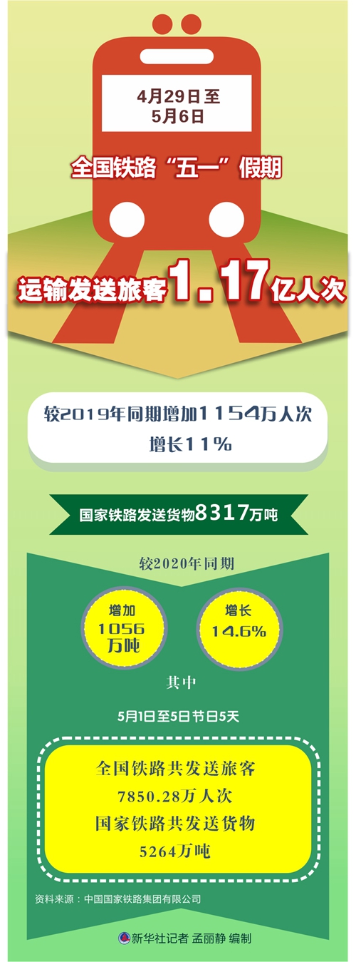 新华社北京5月7日电(记者樊曦)记者从中国国家铁路集团有限公司获悉,4月29日至5月6日,为期8天的全国铁路“五一”假期运输圆满结束,共发送旅客1.17亿人次。