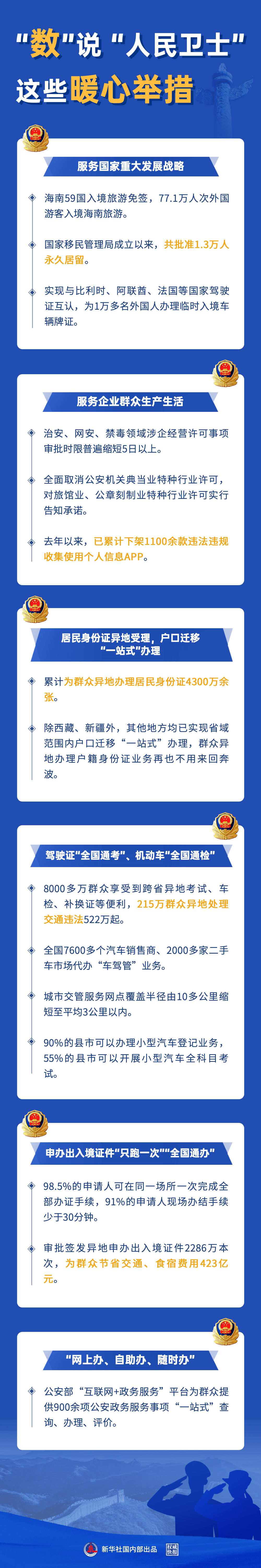 两年前的今天——2019年5月7日,全国公安工作会议在北京召开,强调要推出更多更高质量的服务举措,着力解决好群众办事难、办事慢、来回跑、不方便等突出问题,让人民群众有更多更直接更实在的获得感。同年7月,公安部制定下发《公安机关服务经济社会发展服务企业群众60项措施》。近两年来,一批便民利企的新举措纷纷落地,“人民卫士”这些暖心举措,你了解多少?是否感受到满满的获得感?