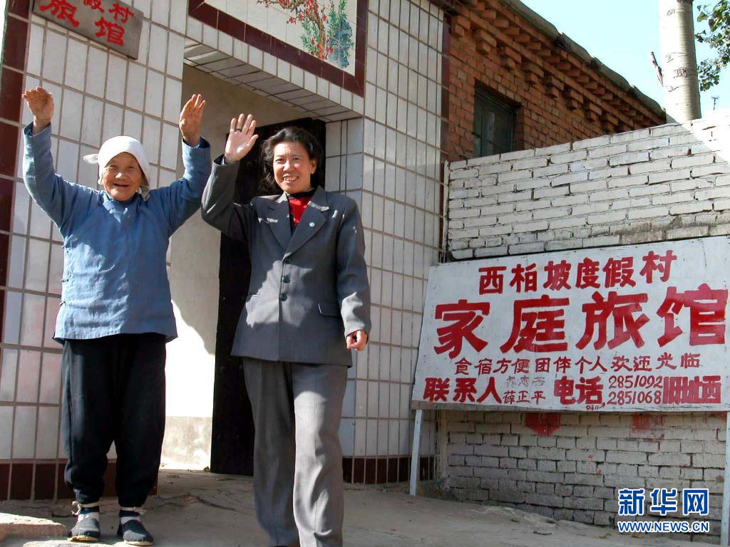 河北平山县西柏坡的农民闫林风和她的婆婆在自家办的家庭旅馆前和旅客挥手告别(2003年10月21日摄)。新华社记者 巩志宏 摄