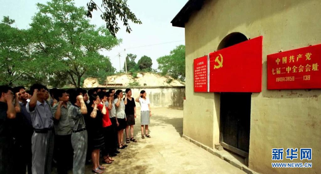 这是新党员在党的七届二中全会会址举行入党宣誓仪式(2001年7月1日摄)。新华社记者 周文广 摄