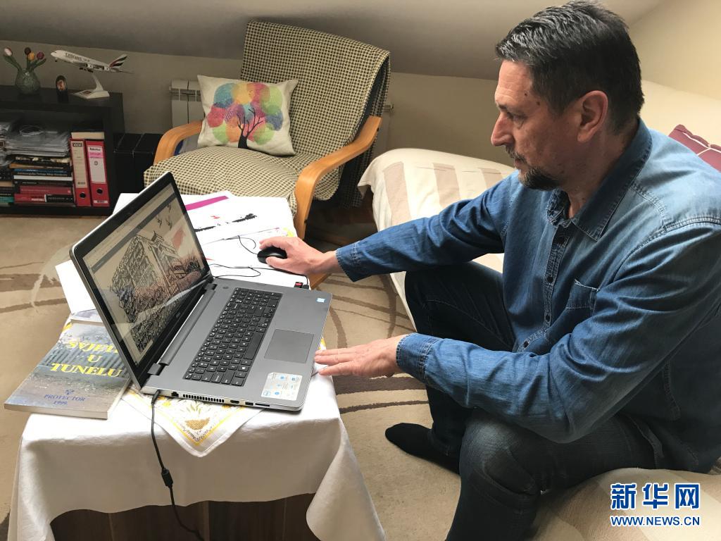 5月4日,在波黑萨拉热窝,耶兹迪米尔·米洛舍维奇在电脑上展示一幅自己制作的绘画作品。新华社记者 张修智 摄