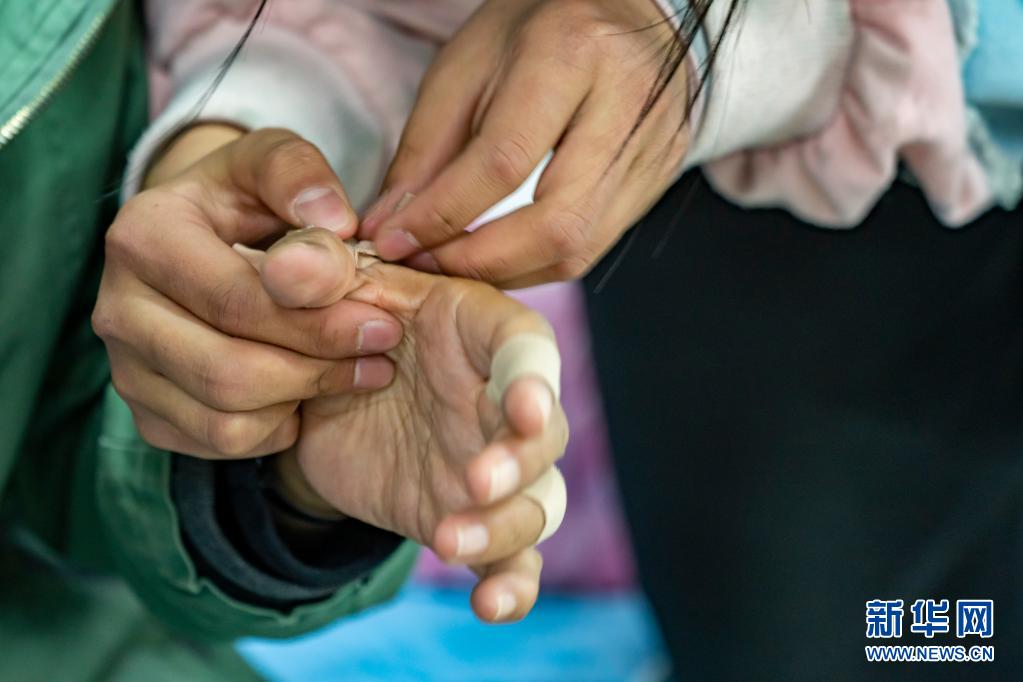 每天回到福利院,孩子们都会帮张桂梅撕掉贴了一天的止痛胶带(3月23日摄)。新华社记者 江文耀 摄