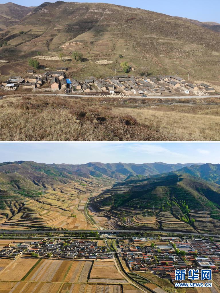 这张拼版照片的上图为:山西省忻州市岢岚县宋家沟村村民在整村搬迁前居住的房屋(资料照片);下图为2020年5月9日拍摄的山西省忻州市岢岚县宋家沟村(无人机照片,新华社记者曹阳摄)。 新华社发