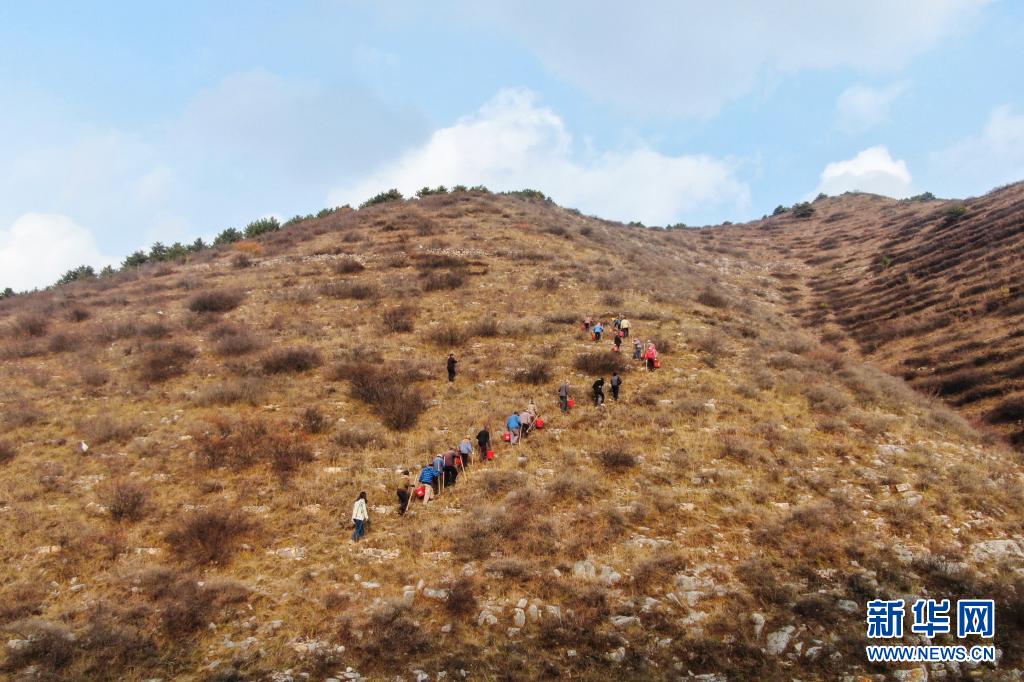山西省长治市平顺县西沟村的村民在众新源脱贫攻坚造林专业合作社负责人常永红的带领下上山植树(2020年10月29日摄,无人机照片)。 新华社记者 柴婷 摄