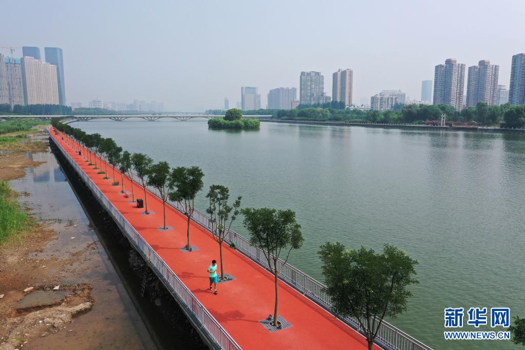 市民在山西省太原市的汾河公园内跑步(2019年7月28日摄,无人机照片)。 新华社记者 杨晨光 摄