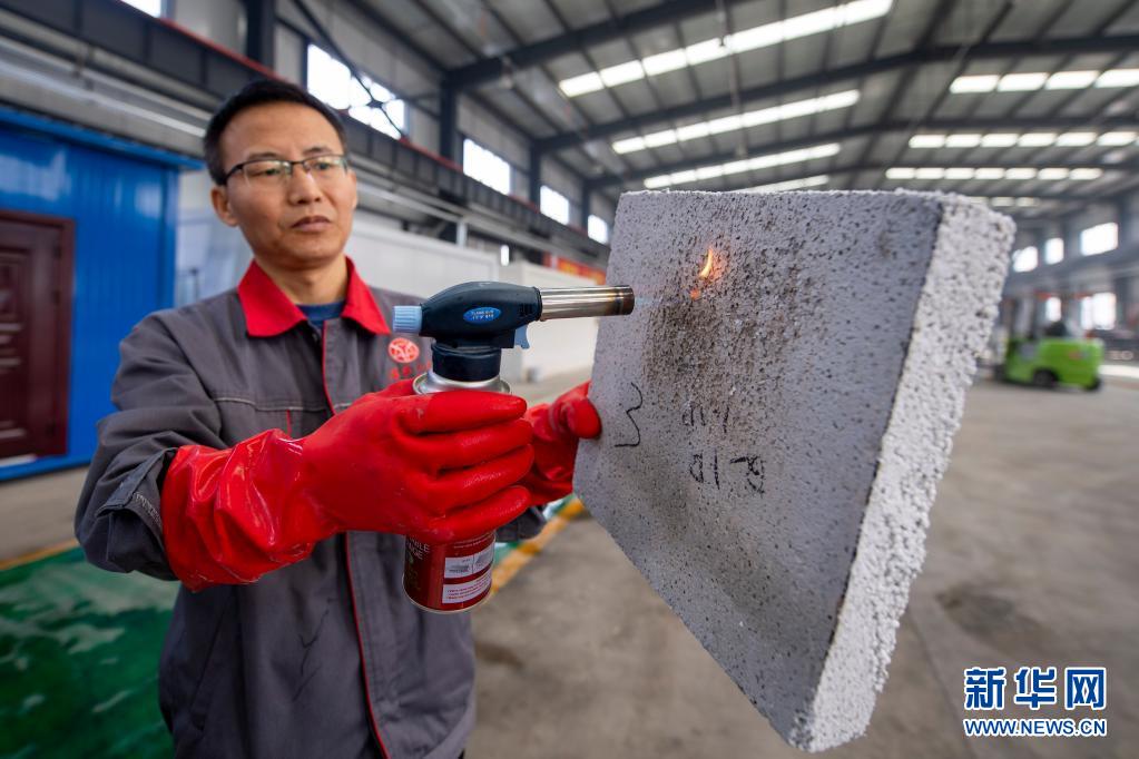 在位于山西省阳泉市的华阳集团宏厦三建公司,工作人员展示气凝胶防火保温板的隔热性能(2021年3月9日摄)。 新华社记者 杨晨光 摄
