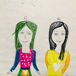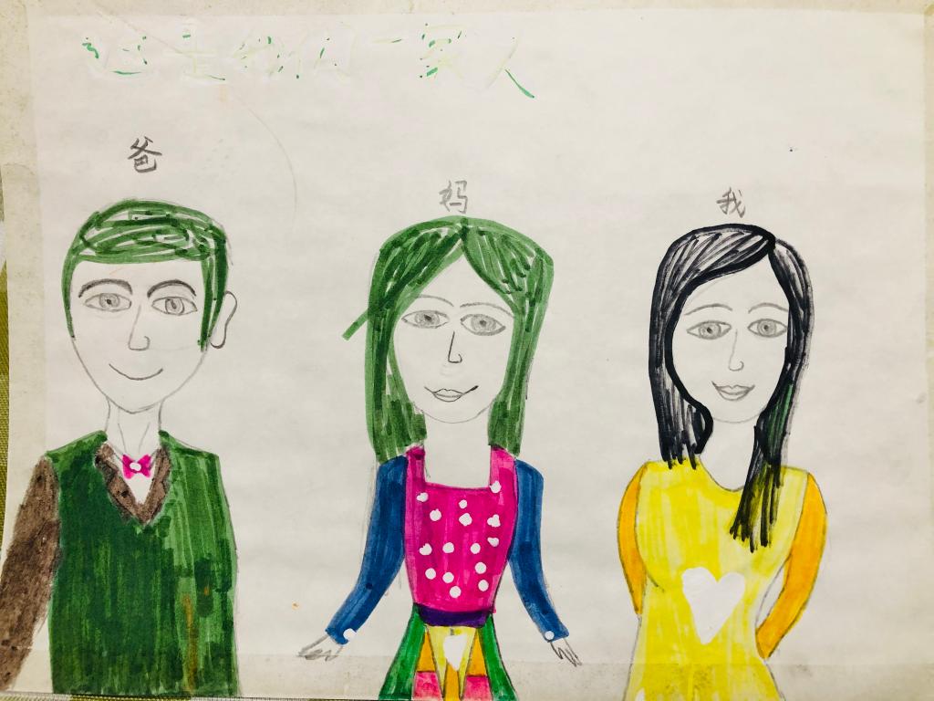 ↑胡玲女儿小学一年级画作《这是我们一家人》。(受访者供图)
