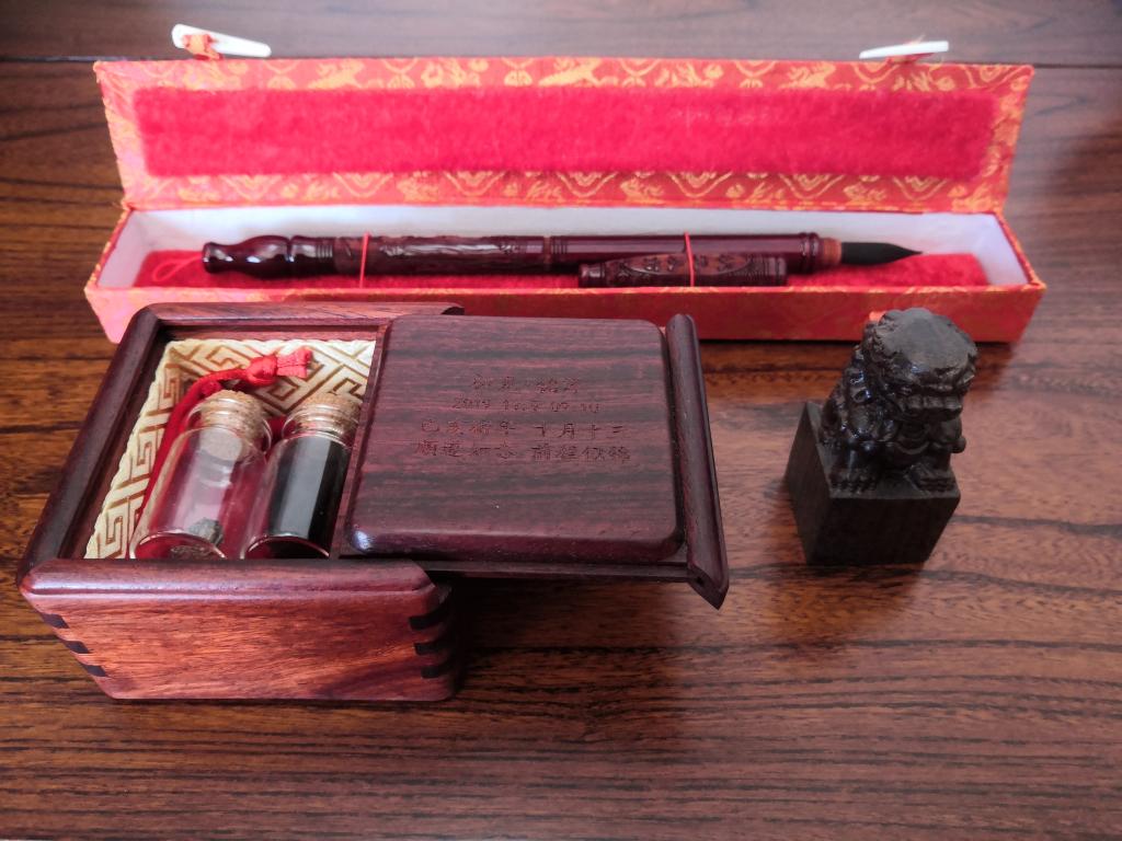 ↑田桐保存的婴儿胎毛笔、脐带印章等。(受访者供图)