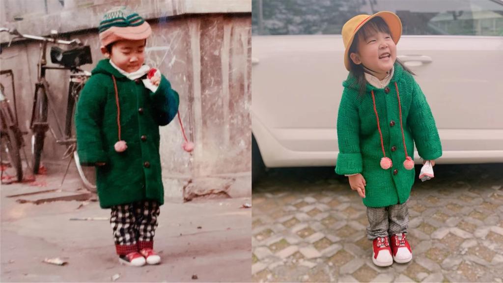 ↑左图是儿子小时候,右图是现在的小孙女。同一件毛衣,跨越35年,穿在了两代人身上。(受访者供图)