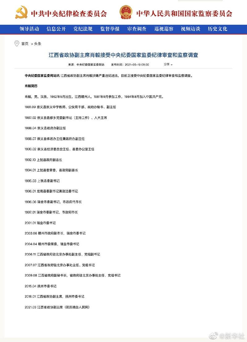 新华社北京5月10日电 江西省政协副主席肖毅涉嫌严重违纪违法,目前正接受中央纪委国家监委纪律审查和监察调查。