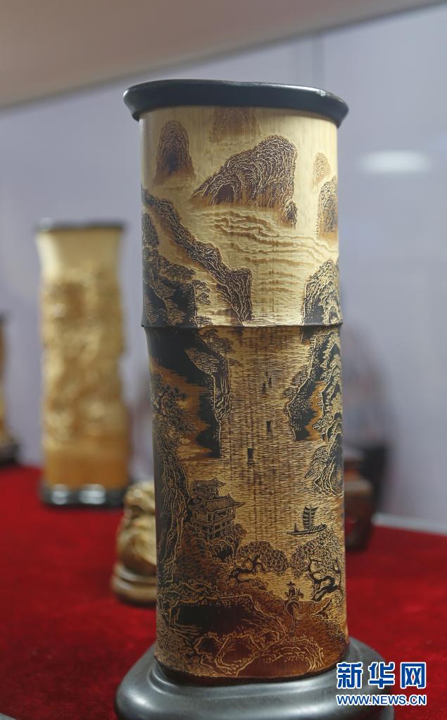 这是5月9日在消博会拍摄的竹雕笔筒。新华社记者 丁洪法 摄