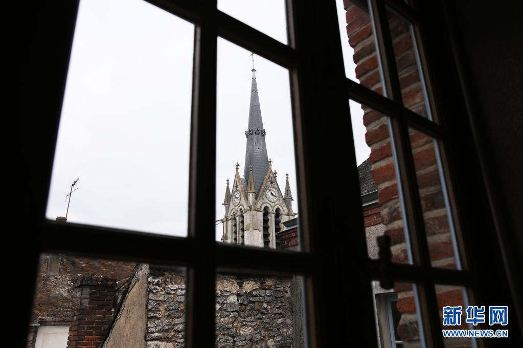 这是3月22日在法国蒙达尔纪市政厅(男子公学旧址)拍到的窗外教堂,与百年前是一样的风景。新华社记者 高静 摄