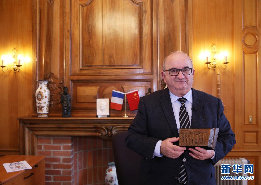 3月22日,法国蒙达尔纪市长伯努瓦·迪容在办公室与《百年丰碑》雕塑模型合影。新华社记者 高静 摄