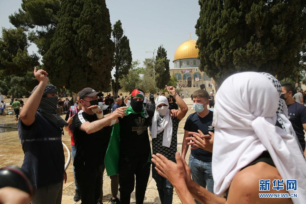5月10日,在耶路撒冷老城圣殿山(穆斯林称“尊贵禁地”),巴勒斯坦民众参加抗议活动。新华社发(穆阿迈尔·阿瓦德 摄)