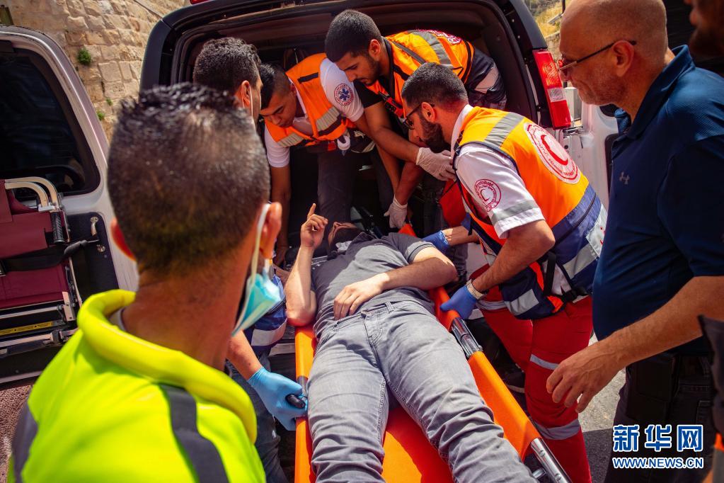 5月10日,一名在耶路撒冷老城圣殿山(穆斯林称“尊贵禁地”)冲突中受伤的巴勒斯坦示威者被送医救治。新华社/基尼图片社