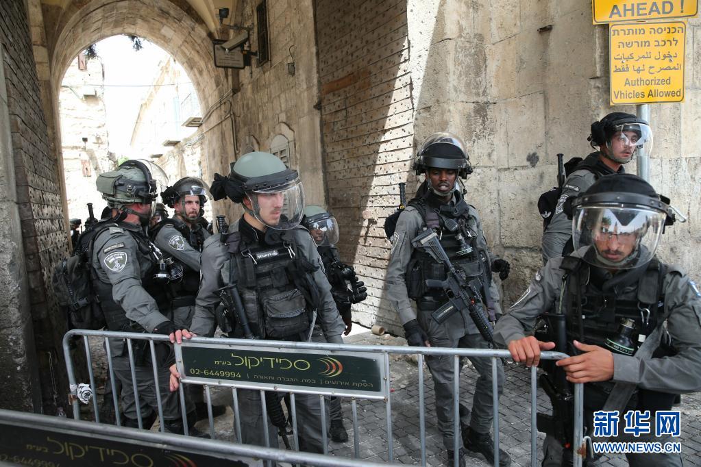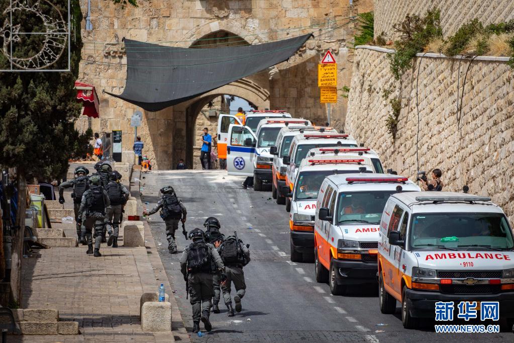 5月10日,以色列警察在耶路撒冷老城圣殿山(穆斯林称“尊贵禁地”)附近执行任务。新华社/基尼图片社