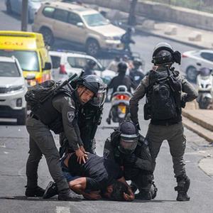 5月10日,在耶路撒冷老城圣殿山(穆斯林称“尊贵禁地”)附近,以色列警察逮捕一名巴勒斯坦示威者。新华社/基尼图片社