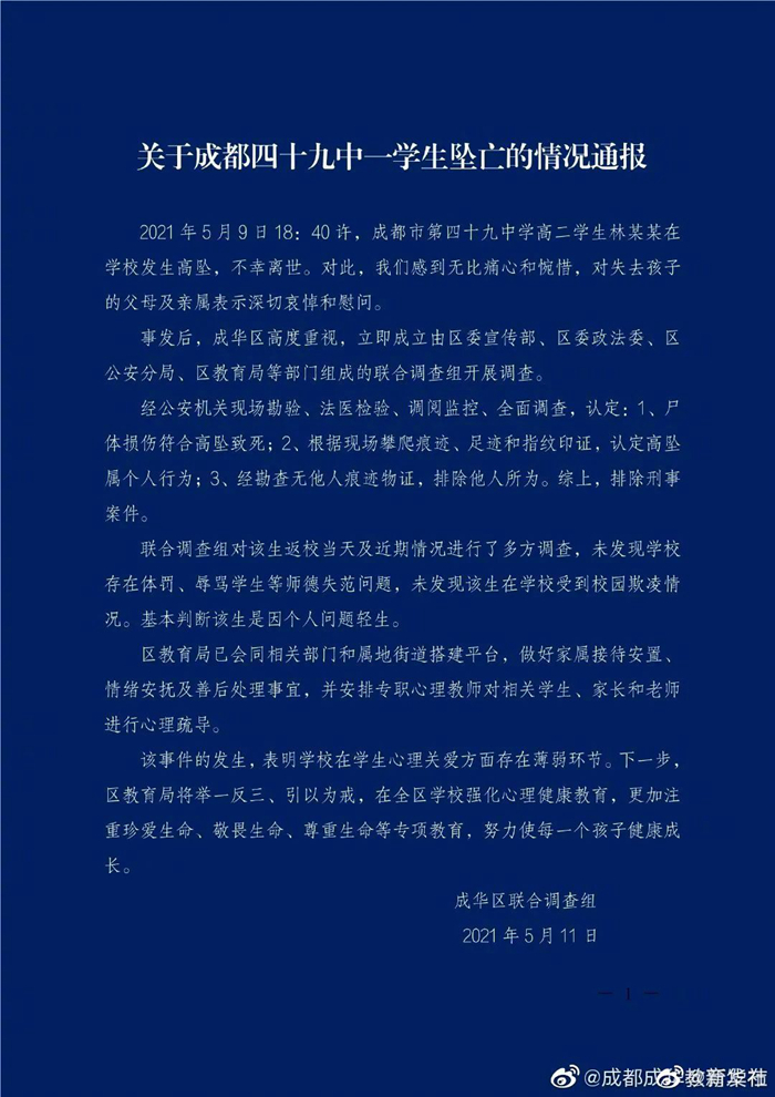 5月11日凌晨,@成都成华教育发布 通报:经公安机关现场勘验、法医检验、调阅监控、全面调查,认定:1.尸体损伤符合高坠致死;2.根据现场攀爬痕迹、足迹和指纹印证,认定高坠属个人行为;3.经勘查无他人痕迹物证,排除他人所为。综上,排除刑事案件。未发现学校存在体罚、辱骂学生等师德失范问题,未发现该生在学校受到校园欺凌情况。