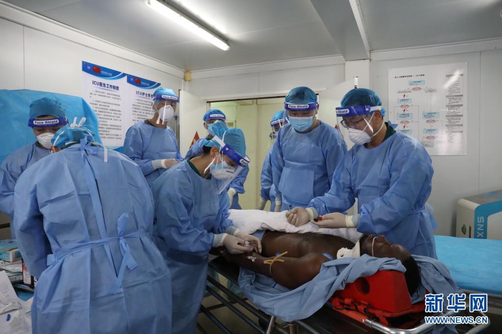 唐晓丹(左一)和战友一起为中国警卫分队官兵巡诊(2月4日摄)。新华社发(黄松 摄)