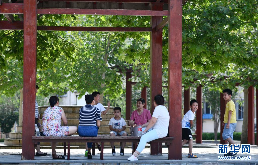 2020年7月7日,天津市西青区精武镇付村富家湾小区的居民在凉亭休息。新华社记者 李然 摄