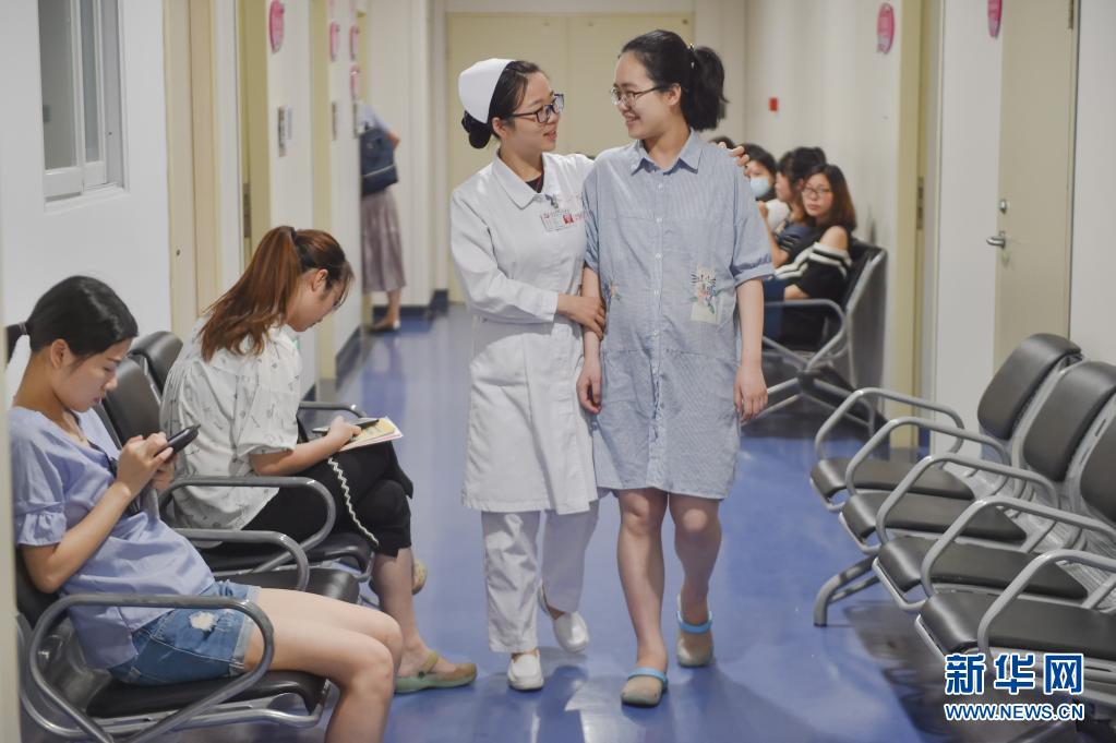2018年6月12日,福建省妇幼保健院产科门诊护士引导一位通过手机预约产检的孕妇就医。新华社记者 宋为伟 摄