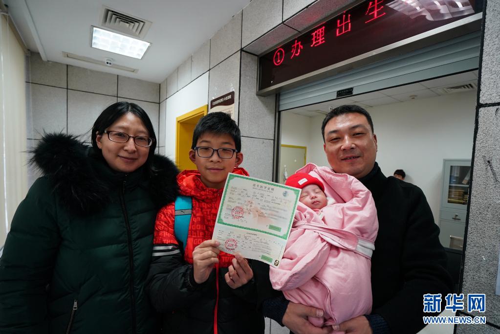 2019年1月1日,在南京市妇幼保健院,为二胎宝宝领取新版出生医学证明的顾先生一家四口合影留念。新华社记者 季春鹏 摄