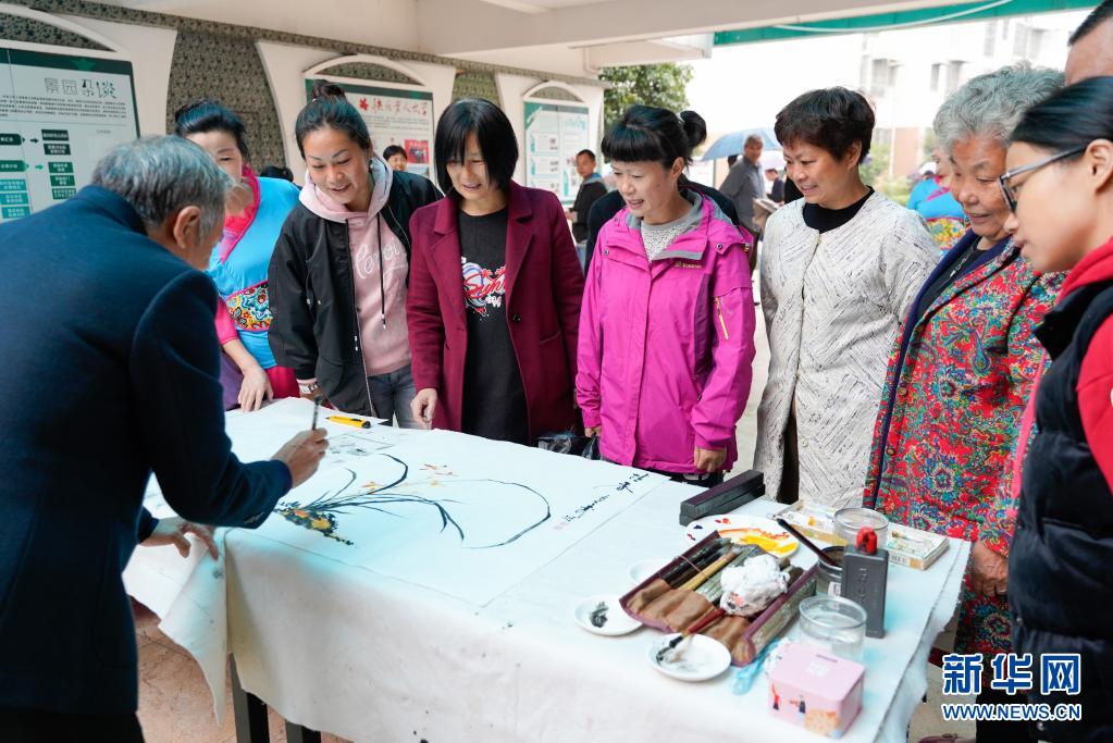 2018年10月15日,在湖南省长沙市,快乐老人大学科大景园校区绘画班班长多文武为社区居民现场作画。新华社记者 张笑宇 摄