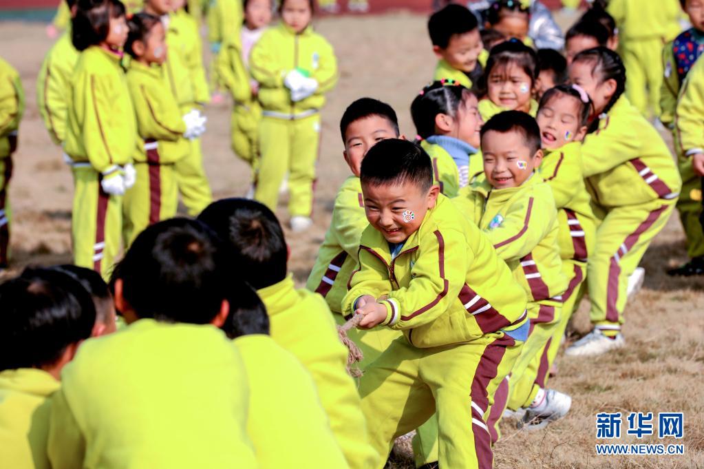 2020年12月25日,浙江省湖州市长兴县洪桥镇中心幼儿园的孩子参加拔河游戏。新华社记者 徐昱 摄