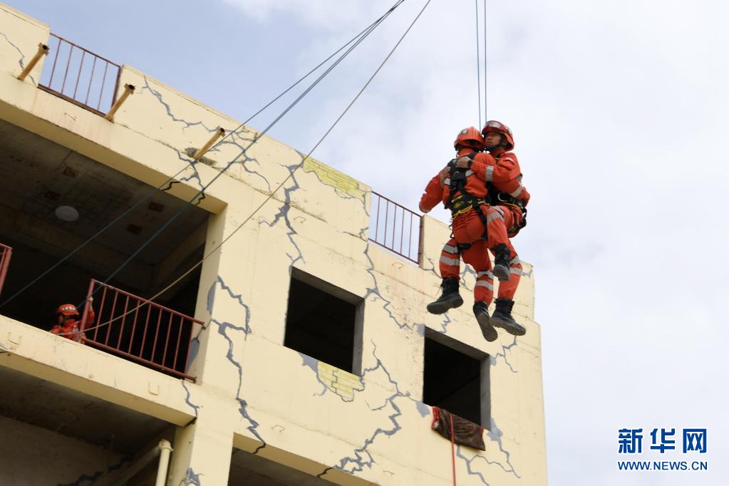 在兰州国家陆地搜寻与救护基地,武警甘肃总队机动支队战士进行绳索救援技术训练(5月10日摄)。